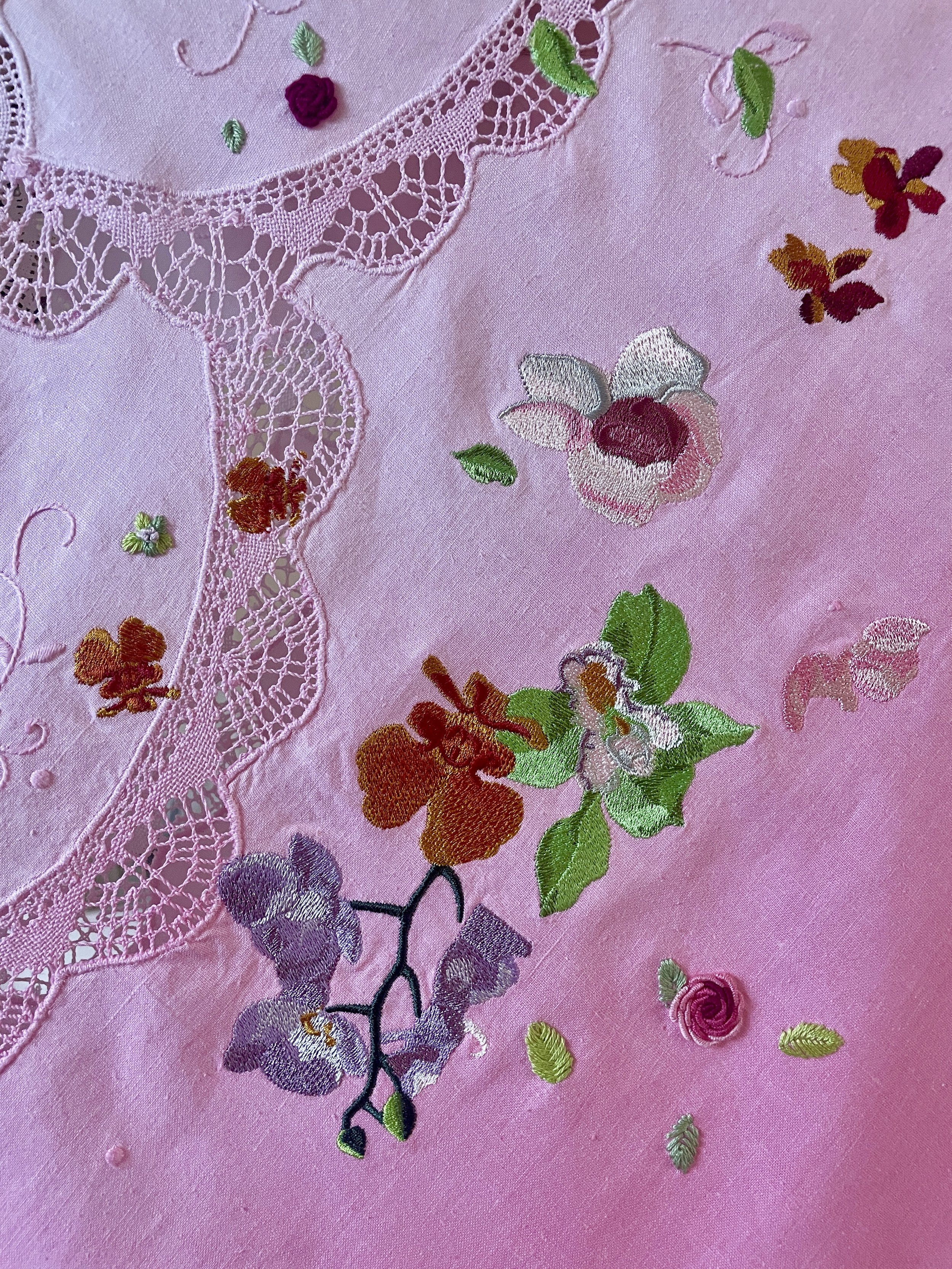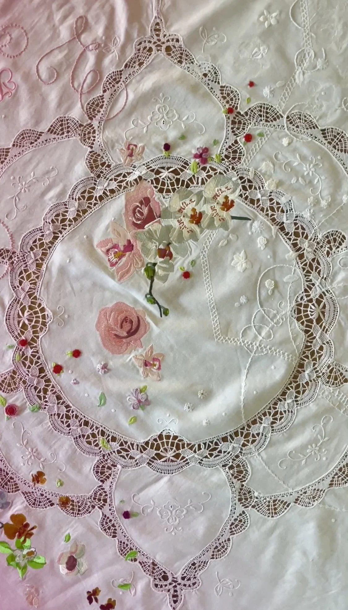 ↑‘The Crumbs’ Hand dyed, hand and machine embroidered English/ Irish linen & cotton table cloth. Music: ‘Attention’ Doja Cat